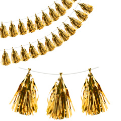 Гирлянда тассел из металлизированной полимерной пленки. Идеально подойдет и для праздничного оформления интерьера, и для декорирования латексных и фольгированных шаров. Гирлянда состоит из 12 пышных кисточек длиной 35 см, в комплект входит веревочка и декоратиный зажим-проволочка для фиксации.